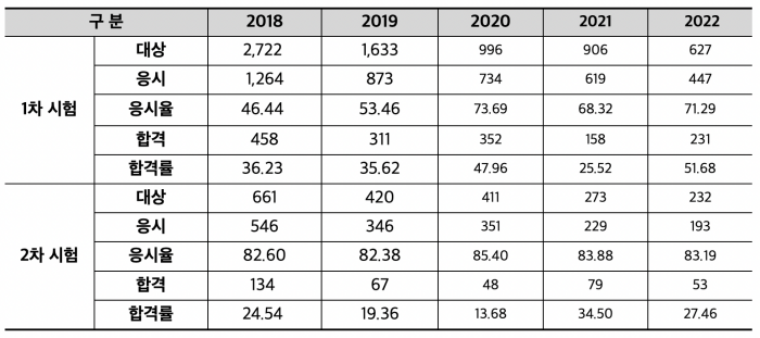 최근 5년의 합격률을 살펴보면 대략 35~50% 수치를 보여주고 있으며, 특이점은 전년도 2022년 합격률이 무려 50%가 넘어섰다는 것입니다. 난이도의 편차가 조금은 있기 때문에 1차 준비를 철저하게 준비하는 것이 좋습니다.
