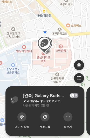 위 사진처럼 내 이어버드 2개의 위치와 충전독 위치까지 함께 지도에 표시되는 것을 볼 수 있습니다. 이어폰의 전원이 꺼지더라도 마지막까지 위치가 수신된 곳이 표시되기 때문에 어떤 장소에서 분실이 되었는지 쉽게 파악이 됩니다.