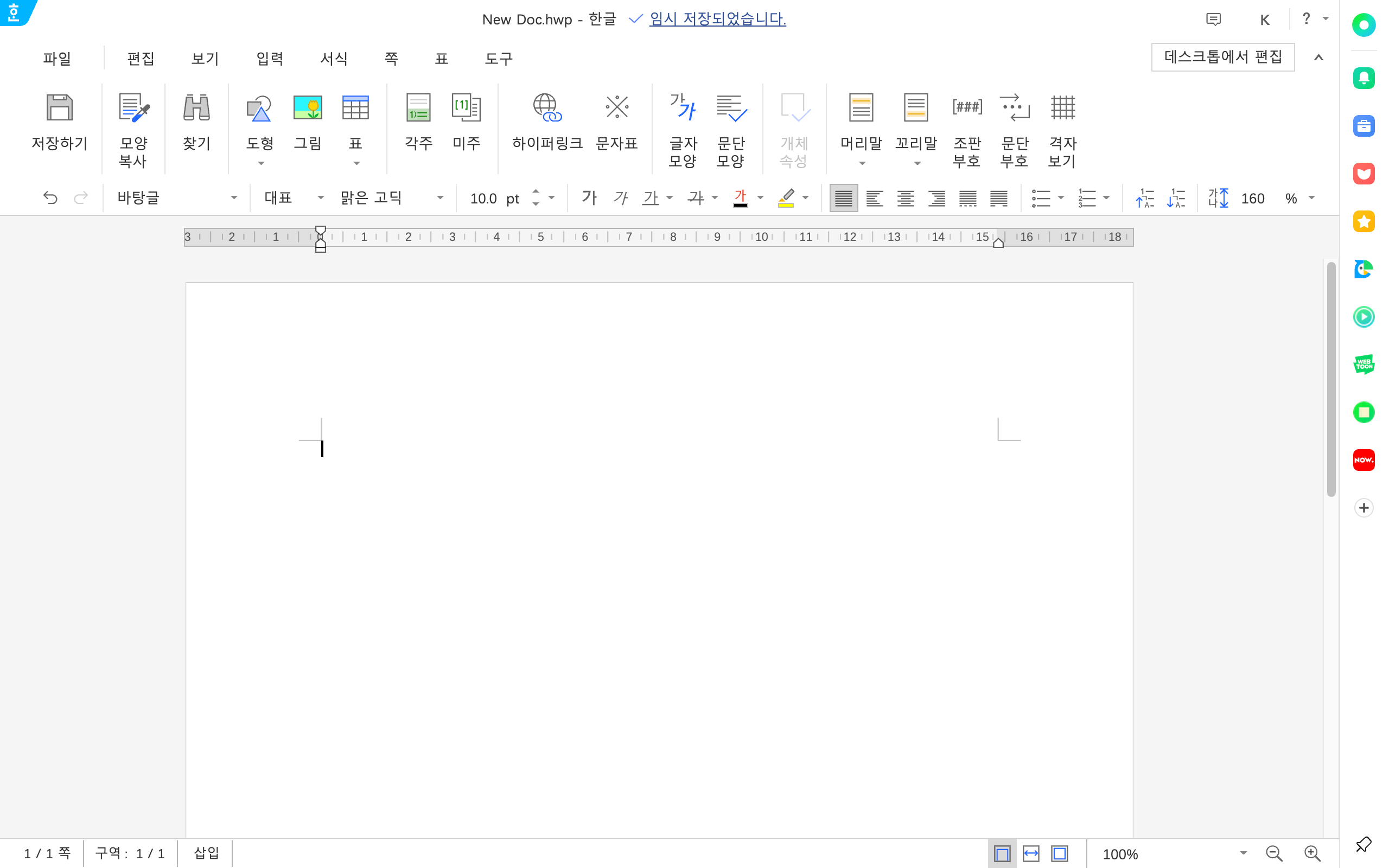 한컴스페이스 작업화면입니다. 일반 한컴오피스와 같은 인터페이스 작업환경을 제공하기 때문에 위화감 없이 편안하게 문서작업을 진행할 수가 있습니다. 이것을 무료로 사용할 수 있다니 정말 놀랍습니다.