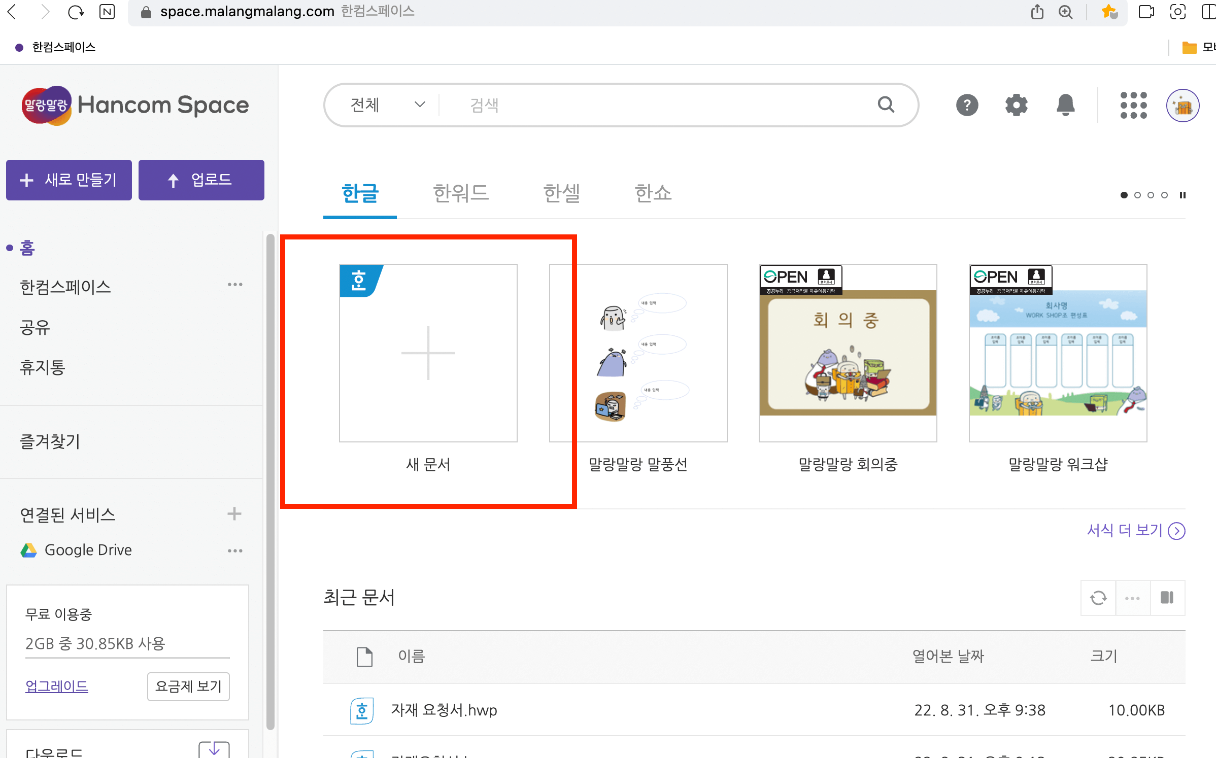 한컴 스페이스에 로그인된 메인화면입니다.'새문서'를 클릭하면 바로 한글 작업을 시작할 수 있습니다. 작업 도중 또는 작업을 끝내고 저장을 하면 웹상으로 저장이 이루어지기 때문에 다른 환경에서도 편리하게 작업을 이어갈 수가 있습니다. 기본 제공 웹용량이 2GB나 되기 때문에 웬만한 작업도 무리 없이 진행할 수가 있습니다.